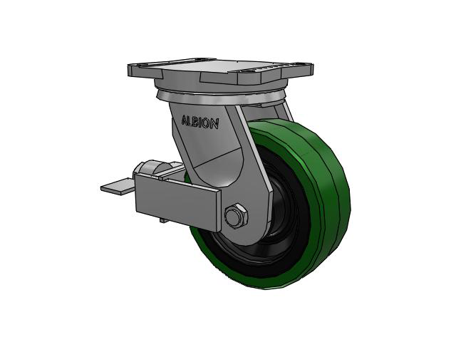 Albion 94TRL Super Duty Casters utilize a precision roller bearing load and thrust swivel section. The swivel load raceway uses a 5-inch outside diameter precision tapered roller bearing. The thrust raceway uses a 1-1/4-inch tapered roller bearing. Combined with AISI 1405 drop forged steel top plate and yoke base, 94TRL casters have a long life with large weight capacities, perfect for very rugged applications.