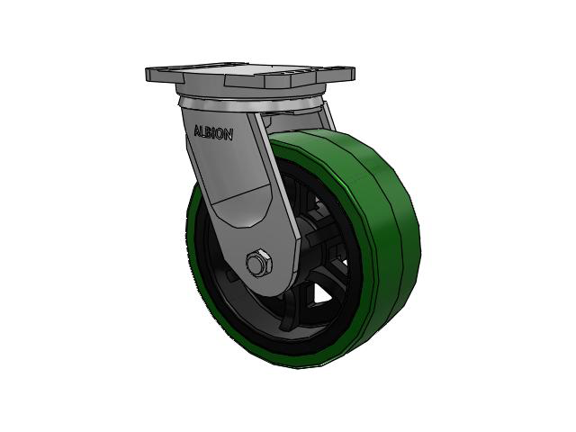 Albion 94TRL Super Duty Casters utilize a precision roller bearing load and thrust swivel section. The swivel load raceway uses a 5-inch outside diameter precision tapered roller bearing. The thrust raceway uses a 1-1/4-inch tapered roller bearing. Combined with AISI 1405 drop forged steel top plate and yoke base, 94TRL casters have a long life with large weight capacities, perfect for very rugged applications.