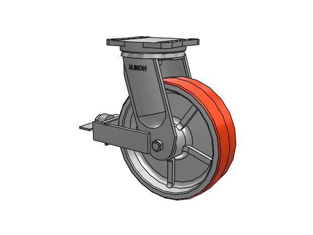 Albion 94TRL Super Duty Casters utilize a precision roller bearing load and thrust swivel section. The swivel load raceway uses a 5-inch outside diameter precision tapered roller bearing. The thrust raceway uses a 1-1/4-inch tapered roller bearing. Combined with AISI 1405 drop forged steel top plate and yoke base, 94TRL casters have a long life with large weight capacities, perfect for very rugged applications.