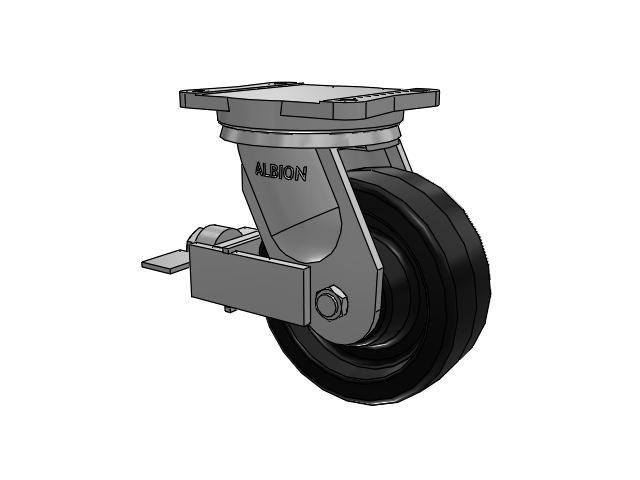 Albion 94TRL Super Duty Casters utilize a precision roller bearing load and thrust swivel section. The swivel load raceway uses a 5-inch outside diameter precision tapered roller bearing. The thrust raceway uses a 1-1/4-inch tapered roller bearing. Combined with AISI 1405 drop forged steel top plate and yoke base, 94TRL casters have a long life with large weight capacities, perfect for very rugged applications.