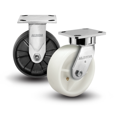 Albion 120 series are 2-inch wide kingpinless casters constructed from 304 stainless steel. A precision-machined swivel section is welded inside and outside to legs for maximum durability. The stainless construction is highly polished, and is ideal for applications exposed to cleaning agents, wash-downs, caustic solutions, steam, marine environments, or any other corrosive agents that could cause rust. Kingpinless casters provide greater reliability and eliminate kingpin failure – the leading cause of caster failure.