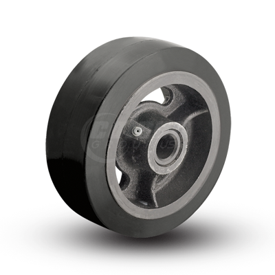 These heavy duty cushion rubber treads are vulcanized to cast iron cores. The harder rubber tread still provides a cushion effect to the load and excellent floor protection. These wheels are highly shocking absorbing and provide a quiet operation while dampening vibrations.