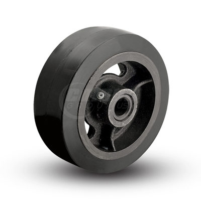 Mold-on cushion rubber treads are vulcanized to cast iron cores. The soft rubber tread affords a cushion effect to the load. These wheels are highly shock-absorbing and provide quiet operation, while dampening vibration.
