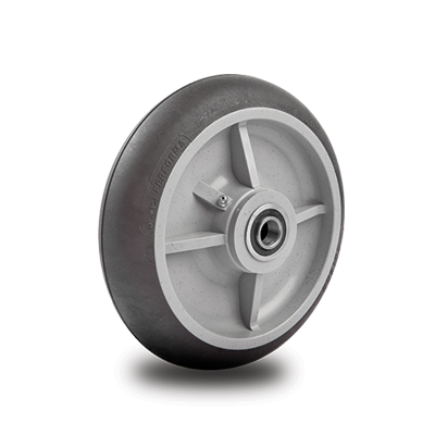 This black or grey tread wheel is a light weight, high performance hand truck wheel that rolls longer, quieter and smoother without marking floors. The exclusive wheel design features a zerk fitting for the wheel bearing and provides maximum rolling ease for greater maneuverability on the job. The exclusive wheel tread material won’t pick up gravel or floor debris, and this wheel performs better than a pneumatic tire...yet never goes flat! Like all of our Performa models, the wheel provides maximum shock absorption for a cushioned ride and will not flatspot... even under load. The materials give superior weather resistance and lower temperature flexibility, as well as a high resistance to chemicals, acids, water and steam. Temperature Range: -45ºF to +180ºF intermittent service (120º continuous service) Hardness: 55(±5) Durometer Shore A scale